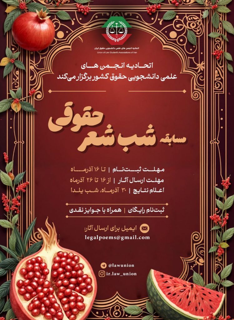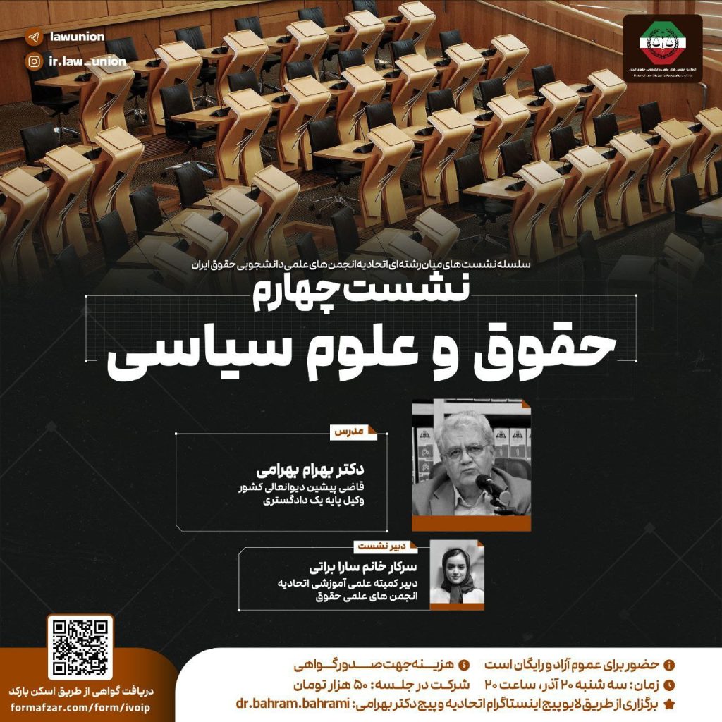 🇮🇷⚖🇮🇷 اتحادیه انجمنهای علمی دانشجویی حقوق ایران با افتخار برگزار می نماید: ♦️سلسله نشستهای بررسی ارتباط متقابل میان علم حقوق و سایر علوم انسانی ♦️نشست چهارم: حقوق و علوم سیاسی سخنران:دکتر بهرام بهرامی قاضی پیشین دیوانعالی کشور وکیل دادگستری دبیر…