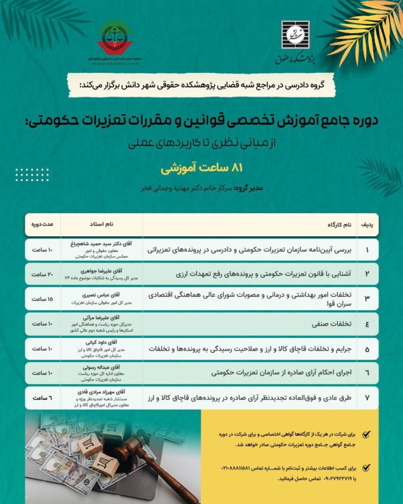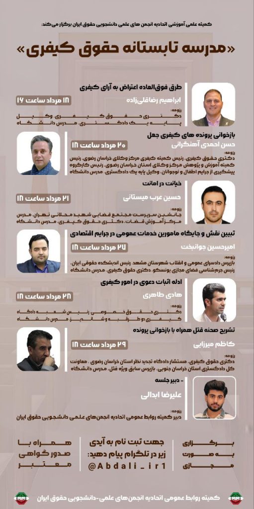 🇮🇷⚖🇮🇷 «به نام خداوند عادل» کمیته علمی آموزشی اتحادیه انجمنهای علمی دانشجویی حقوق ایران برگزار میکند: 💠مدرسه تابستانه حقوق کیفری سلسله نشستهایی تخصصی با محوریت آموزش مباحث کاربردی حقوق کیفری، ویژه دانشجویان و علاقهمندان به حوزهی کیفری 🔶 نشست نخست:…