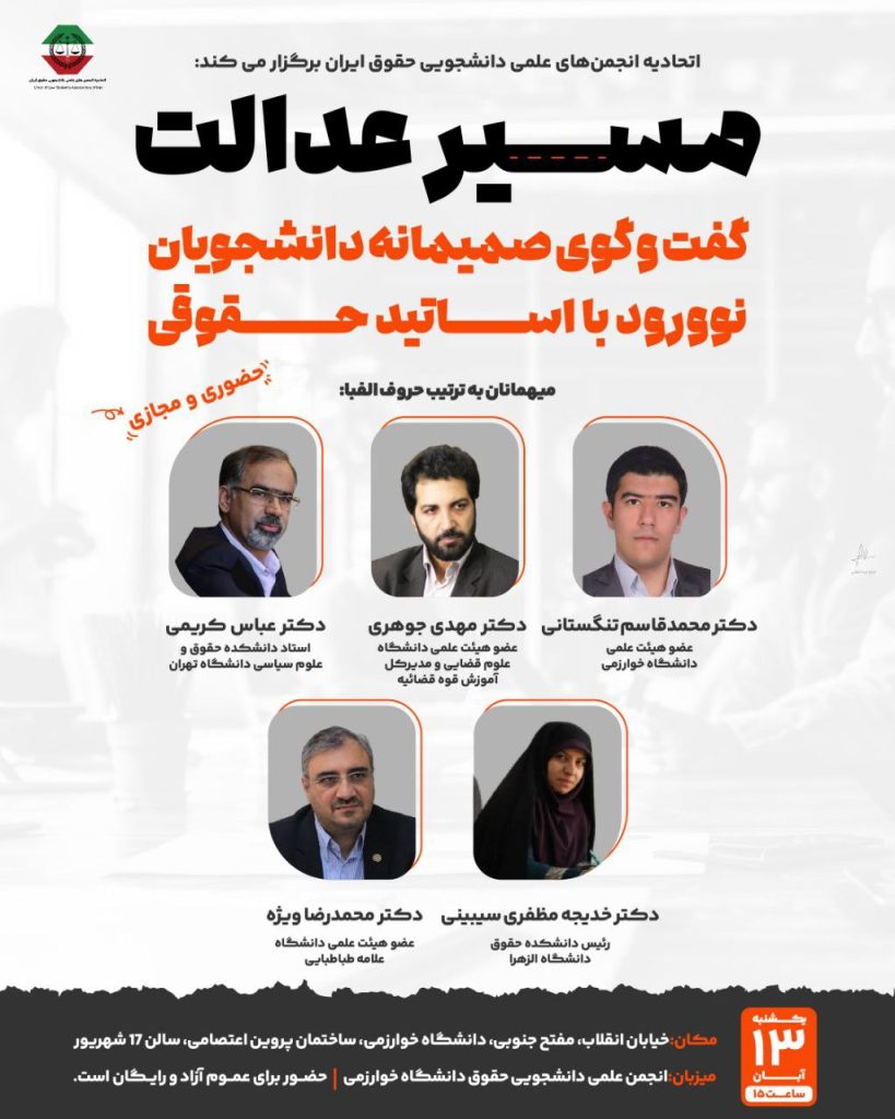🇮🇷⚖🇮🇷 اتحادیه انجمن‌های علمی- دانشجویی حقوق ایران برگزار می‌کند : 🔸مسیر عدالت (گفتگوی صمیمانه دانشجویان نوورود با اساتید حقوقی) 👥 میهمانان به ترتیب حروف الفبا: 📍دکتر محمدقاسم تنگستانی عضو هیئت علمی دانشگاه خوارزمی 📍دکتر مهدی جوهری عضو هیئت علمی دانشگاه…