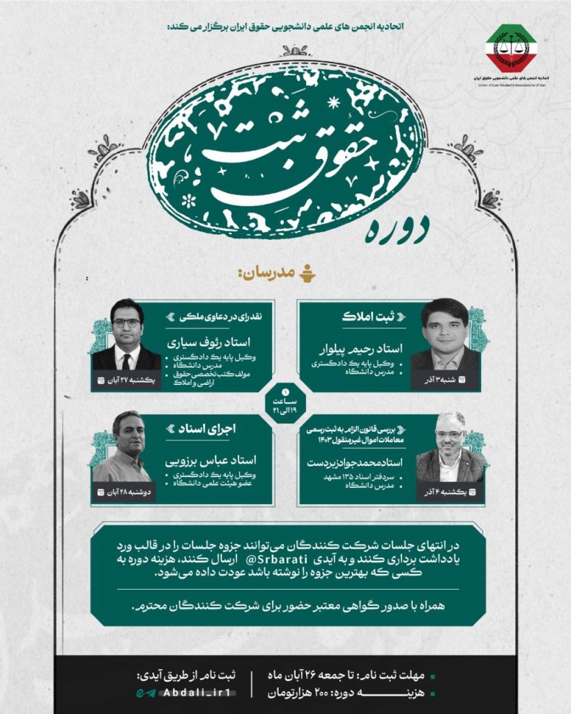 ⚖️🇮🇷⚖️ اتحادیه انجمن های علمی حقوق ایران برگزار می‌کند: 🔺️دوره کاربردي حقوق ثبت 🔺️با حضور اساتید مطرح این حوزه 🔷️همراه با صدور گواهی معتبر اتحادیه برای شرکت کنندگان 🔅جلسات به صورت مجازی برگزار می‌شود ▫️مهلت ثبت نام تا جمعه ۲۶…