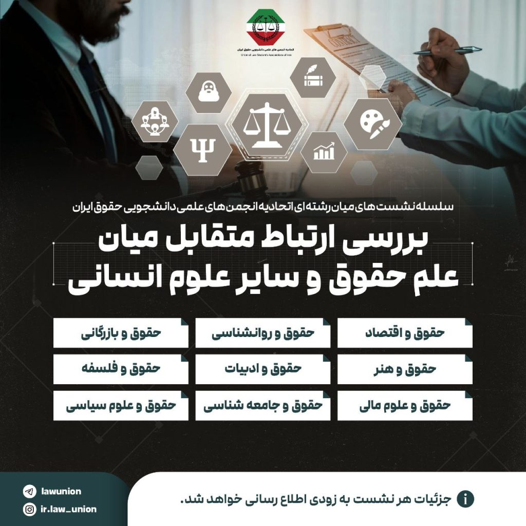 🇮🇷⚖🇮🇷 اتحادیه انجمن‌های علمی دانشجویی حقوق ایران با افتخار برگزار می نماید: ♦️سلسله نشست‌های بررسی ارتباط متقابل میان علم حقوق و سایر علوم انسانی ♦️جزئیات هر نشست به زودی اطلاع رسانی خواهد شد… 🇮🇷⚖🇮🇷 《روابط عمومی اتحادیه انجمن‌های علمی_دانشجویی حقوق…