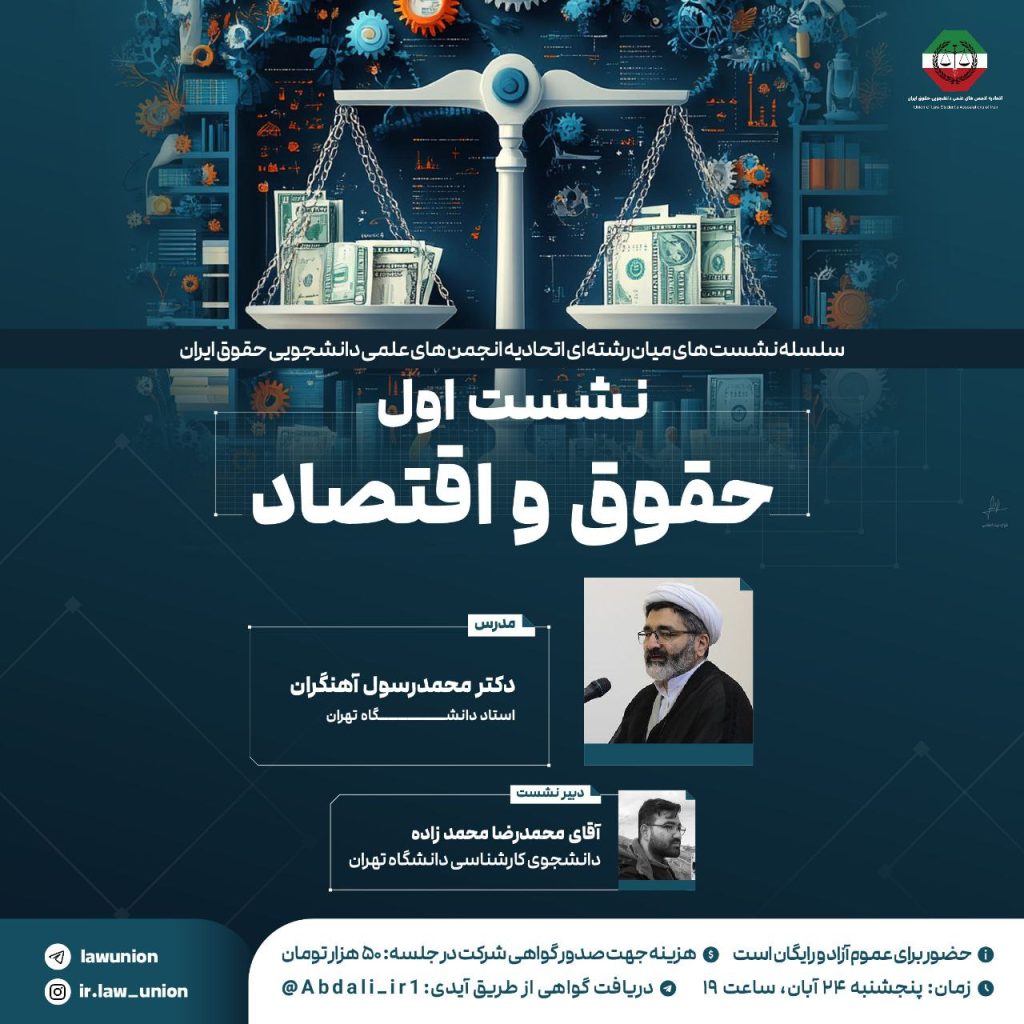 🇮🇷⚖🇮🇷 اتحادیه انجمن‌های علمی دانشجویی حقوق ایران با افتخار برگزار می نماید: ♦️سلسله نشست‌های بررسی ارتباط متقابل میان علم حقوق و سایر علوم انسانی ♦️نشست اول: حقوق و اقتصاد سخنران:دکتر محمد رسول آهنگران استاد دانشگاه تهران دبیر نشست:آقای محمدرضا محمدزاده…